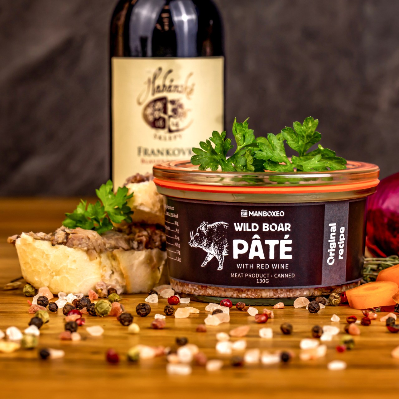 Wildschweinpastete mit Rotwein, 130 g – Eine köstliche Wildschweinpastete, aromatisiert mit Wacholderbeeren und Wildgewürzen, liebevoll mit Rotwein zubereitet. Lässt sich leicht streichen – auch für Zöliakie-Betroffene geeignet.