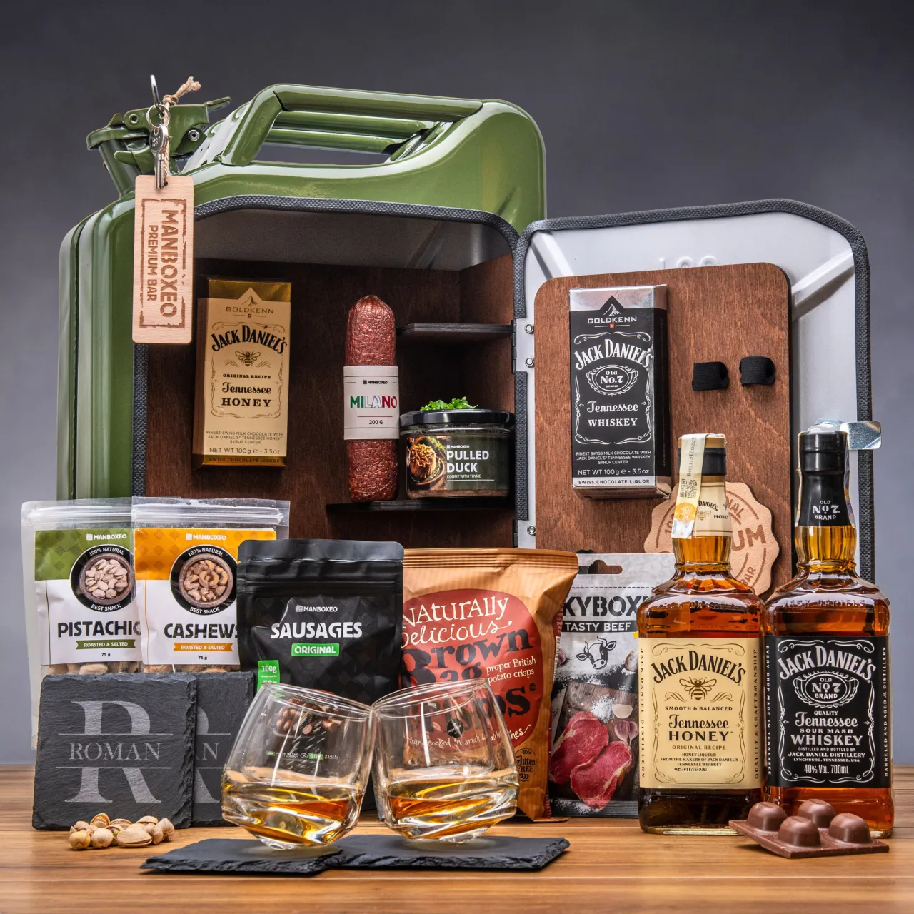 Stoßen Sie auf das Wohl und Glück des Jubilars mit dem Inhalt unserer Kanisterbar an. Neben einer Flasche Jack Daniel’s finden Sie darin praktische Extras, die jeden Schluck noch ein wenig besser machen. Außerdem haben wir süße und salzige Snacks hinzugefügt, die alle Geschmackstöne des Whiskys unterstreichen. Und wie wird der Genuss perfekt? Mit guter Gesellschaft!
