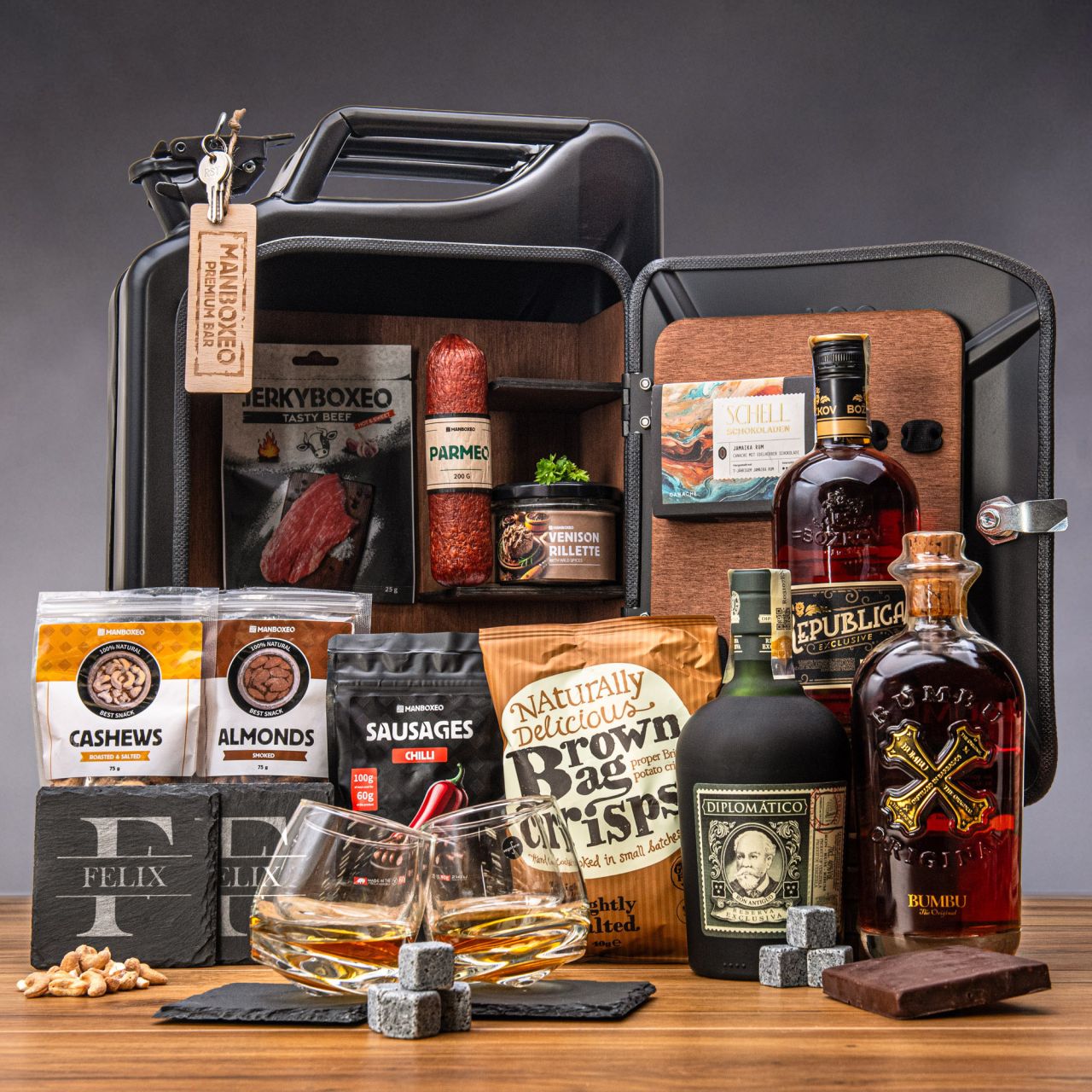 Stoßen Sie auf das Wohl und Glück des Jubilars mit dem Inhalt unserer Kanisterbar an. Neben einer Flasche hochwertigen Rums finden Sie darin praktische Extras, die jeden Schluck noch ein bisschen besser machen. Außerdem haben wir süße und salzige Snacks hinzugefügt, die alle Geschmackstöne des Rums unterstreichen. Und wie wird der Genuss perfekt? Mit guter Gesellschaft!