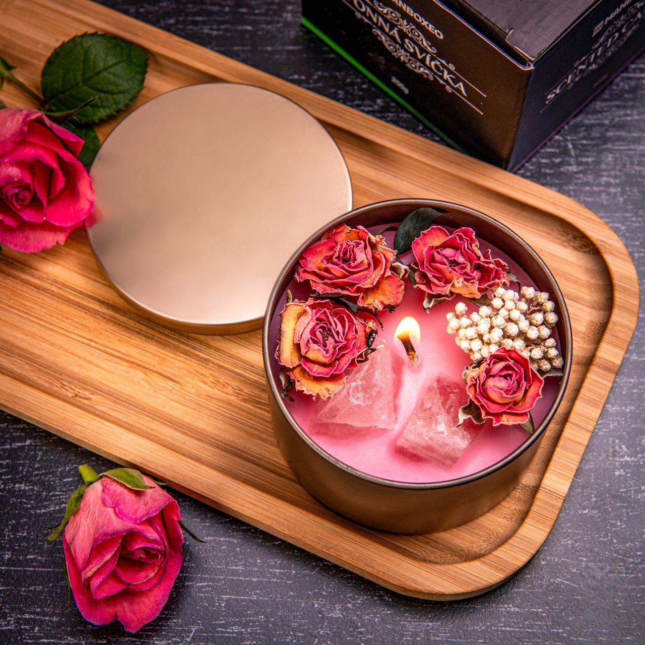Einzigartig gestaltete Kerze in einer Blechdose mit intensivem Duft - Rose 200 g - Klopf, klopf! Wer ist da? Eine Kerze in einer Dose mit Rosenduft. Hergestellt aus Sojawachs mit einem Tropfen natürlichem Duft und dekoriert mit getrockneten Blumen. Dies ist keine Chemie, sondern ein Wunder der Natur.