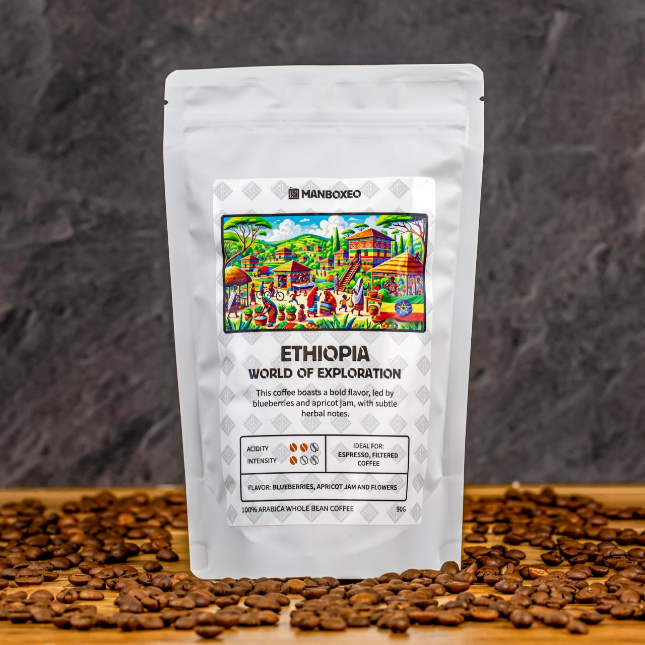 Äthiopien (90 g) – 100 % ARABICA – Vollbohniger Kaffee mit intensivem Schokoladengeschmack, ergänzt durch feine Noten von Beeren und Zitrusfrüchten. Hohe Intensität, geringe Säure. Perfekt für Espresso und Mokka.