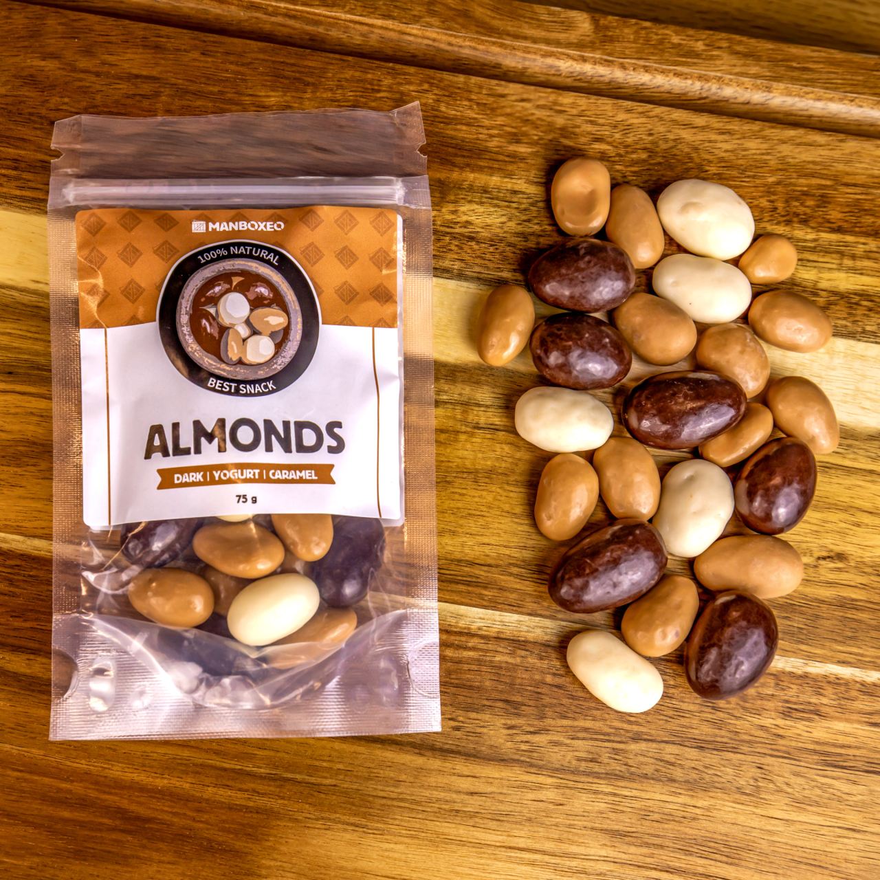 Schokoladenmandeln – Milch, Zartbitter & Weiß 75 g – Zartbitter-, Milch- und weiße Schokolade – drei perfekt abgestimmte Überzüge für köstliche Mandeln. Probieren Sie sie und tauchen Sie ein in diese wunderbare Geschmacksvielfalt.