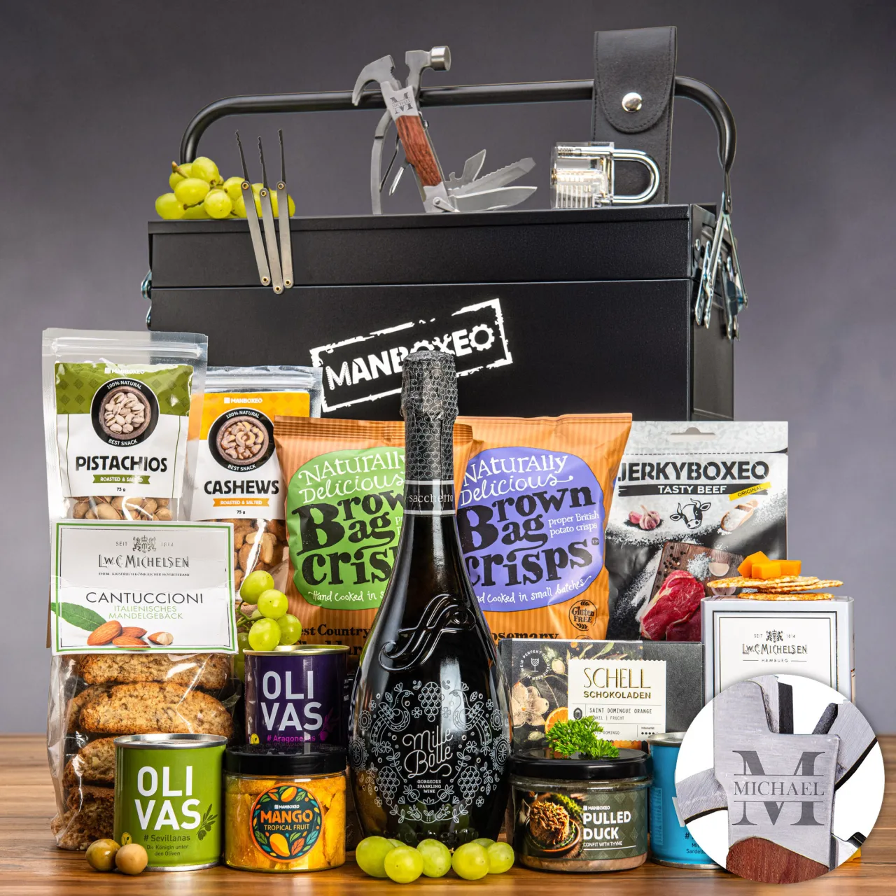 Dachten Sie, dass sich in dieser Blechdose nur Werkzeug verbirgt? Falsch gedacht, meine Damen und Herren. Wer dieses Schmuckstück geschenkt bekommt, darf sich auf ein echtes Gourmet-Erlebnis freuen. Eine Flasche hochwertigen Prosecco haben wir mit köstlichen Snacks ergänzt, die perfekt zum Trinken passen. Ob herzhaft, süß oder fleischig – jede Leckerei lädt zum Probieren und Genießen ein. Und als Überraschung haben wir noch ein spezielles Multifunktionswerkzeug für Heimwerker beigelegt.