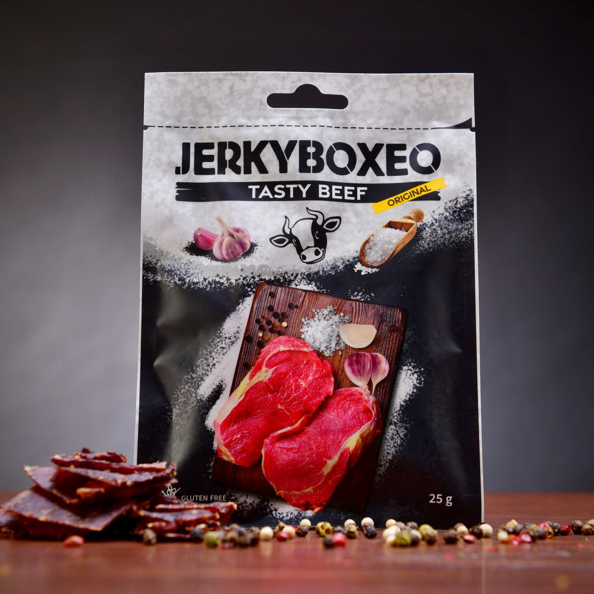 Jerkyboxeo TASTY BEEF 25 g – Der perfekte Reisesnack! Rindfleisch-Jerky mit Totes-Meer-Salz – gibt Energie und passt locker in jede Tasche.