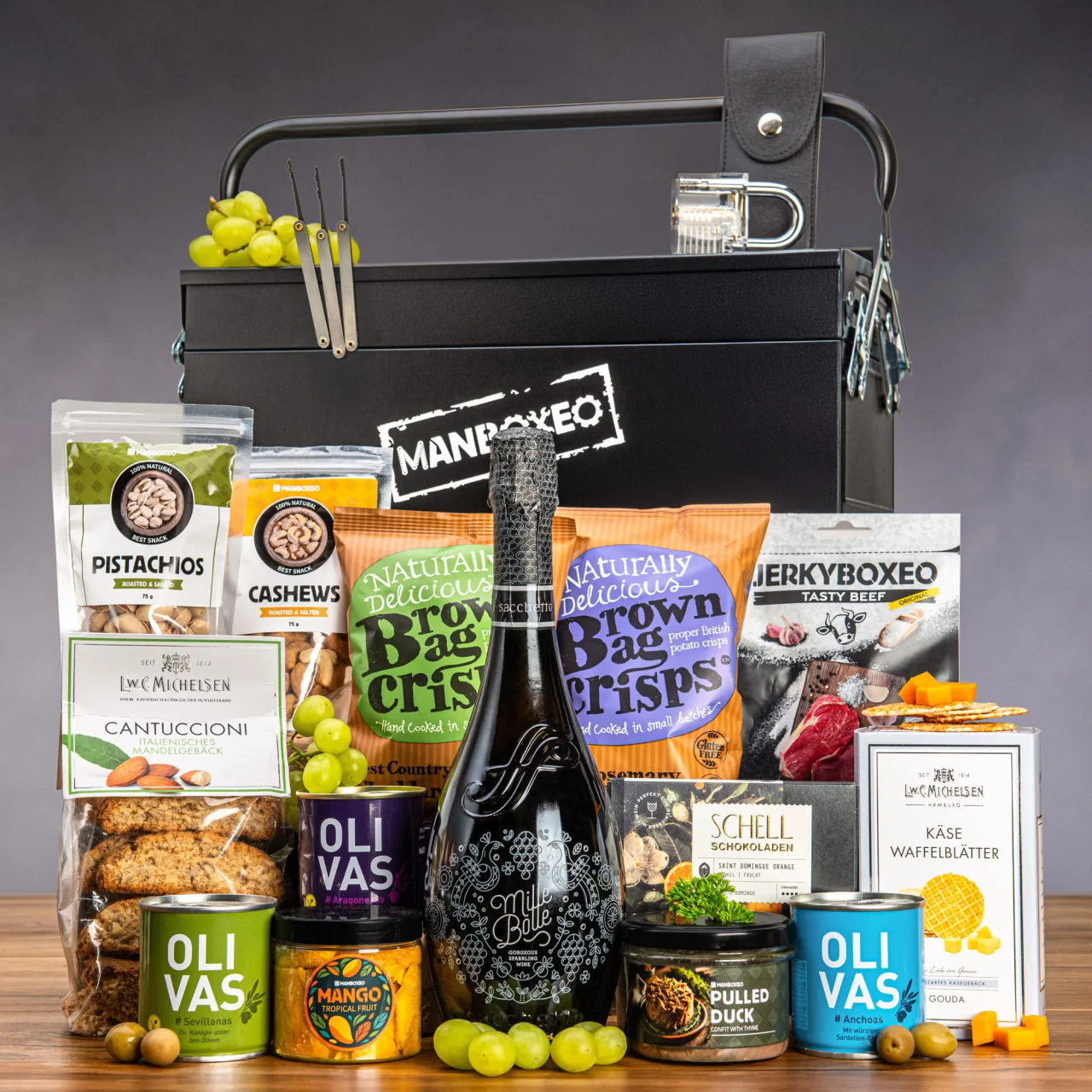 Dachten Sie, dass sich in dieser Blechdose nur Werkzeug verbirgt? Falsch gedacht, meine Damen und Herren. Wer dieses Schmuckstück geschenkt bekommt, darf sich auf ein echtes Gourmet-Erlebnis freuen. Eine Flasche hochwertigen Prosecco haben wir mit köstlichen Snacks ergänzt, die perfekt zum Trinken passen. Ob herzhaft, süß oder fleischig – jede Leckerei lädt zum Probieren und Genießen ein. Und als Überraschung haben wir noch ein spezielles Multifunktionswerkzeug für Heimwerker beigelegt.