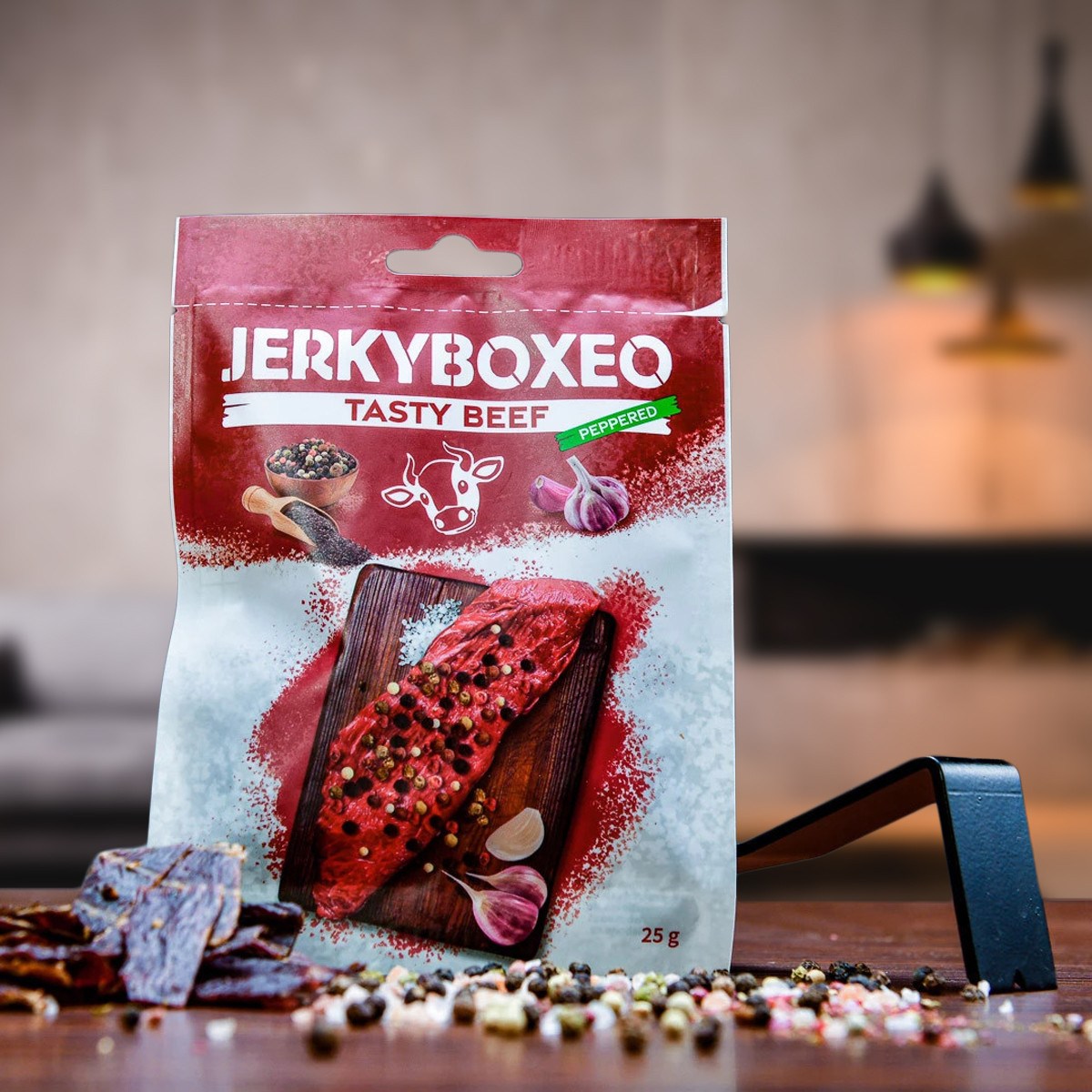 Jerkyboxeo TASTY BEEF HOT AND SWEET – Der perfekte Snack für unterwegs oder im Büro. Rindfleisch-Jerky, gewürzt mit Salz aus dem Toten Meer, einem Hauch Chili und karamelligem Nachgeschmack – gibt Energie und Lust auf mehr Abenteuer. Und passt ganz bequem in die Hosentasche.