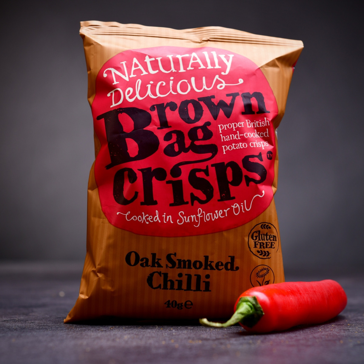 Brown Bag Crisps – Geräuchertes Chili – Der knusprige Kick darf nicht fehlen! Handgemachte Chips aus England mit intensivem Raucharoma und einer Prise Scotch Bonnet Chili – genau das Richtige für alle, die es scharf mögen. Alle Zutaten sind 100 % natürlich.