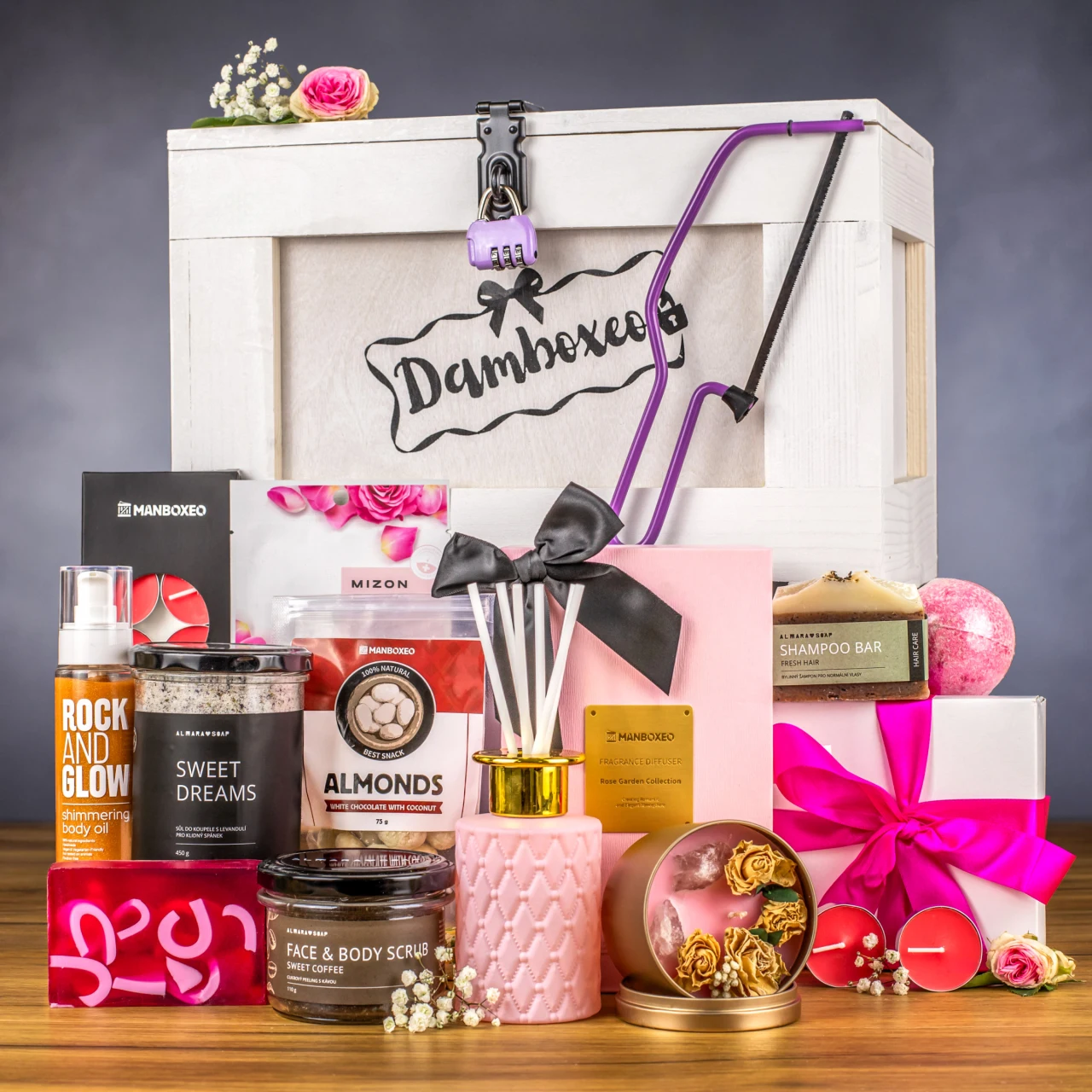 Das Schloss ist offen? Dann wartet auf die Jubilarin eine wohlverdiente Belohnung. Die Truhe ist randvoll gefüllt mit duftenden und essbaren Geschenken. Eine Flasche feines Prosecco, luxuriöse Kosmetik, Duftkerzen und süße Leckereien schaffen ein perfektes Wellness-Erlebnis – ganz bequem zu Hause. Von nun an besser zwischen Frau und Truhe auf Abstand bleiben!