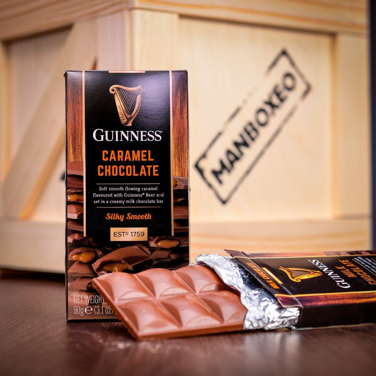 Guinness Vollmilchschokolade mit Karamell 90g – Hochwertige, zartschmelzende Vollmilchschokolade, gefüllt mit Karamell und leicht aromatisiert mit dem berühmten Guinness-Bier. Ein Muss für alle Bierfreunde.