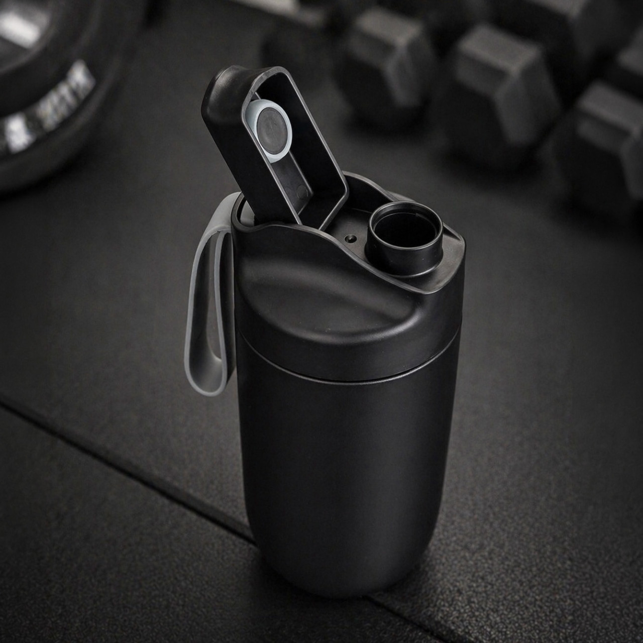 Die matte schwarze Farbe verleiht dem Shaker ein hochwertiges Aussehen, das sich fürs Fitnessstudio, das Büro und auf Reisen eignet. Das minimalistische Design und die präzise Verarbeitung machen ihn zu einem Accessoire, das auf den ersten Blick überzeugt.