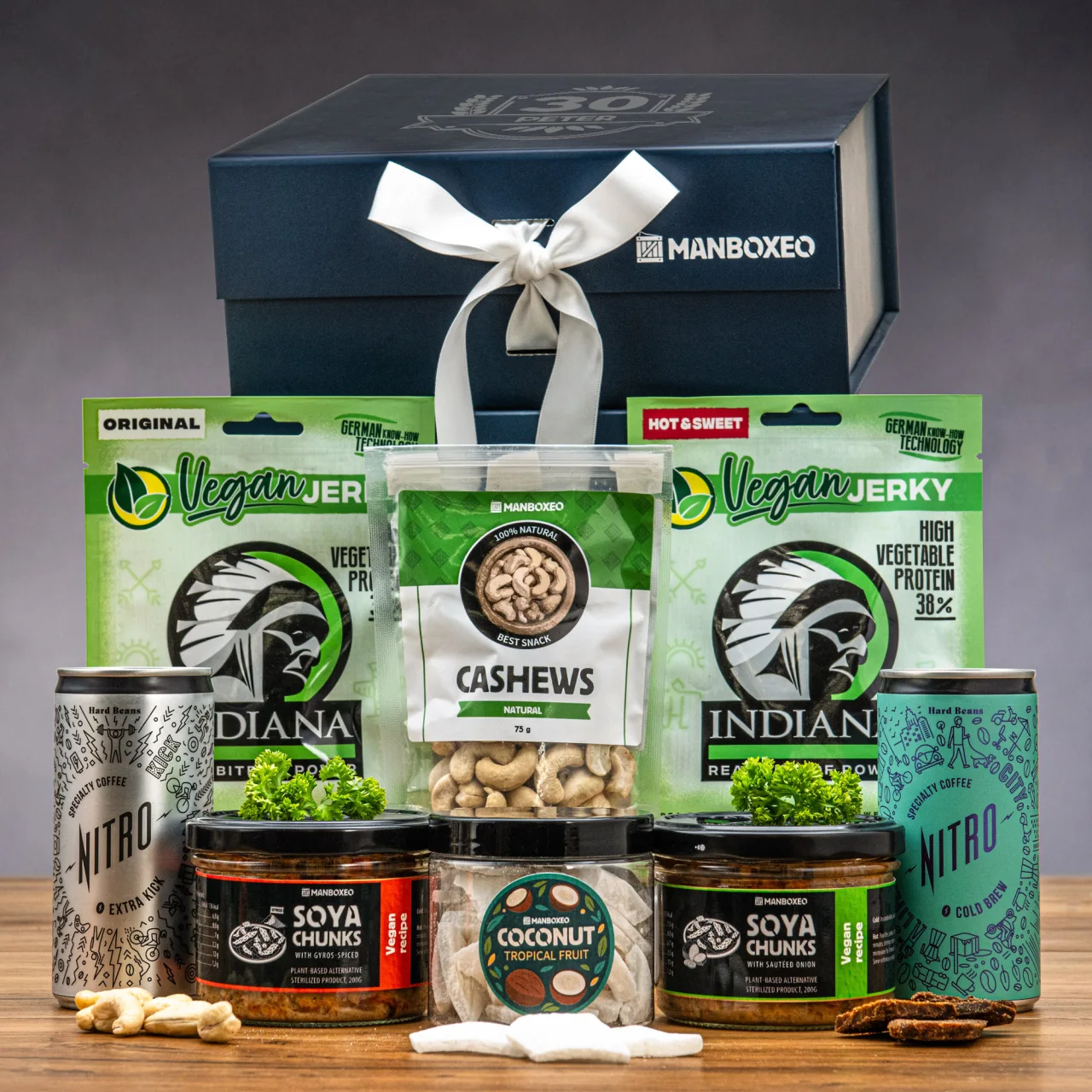 Was verbirgt diese unscheinbare Schachtel? Große Überraschungen! Der Beschenkte darf sich auf vegane Spezialitäten freuen, die all seine Sinne verzaubern. Leckere Snacks, Premium-Kaffee – und damit ist noch lange nicht Schluss. Das muss man einfach am eigenen Leib… oder besser mit allen Sinnen erleben!