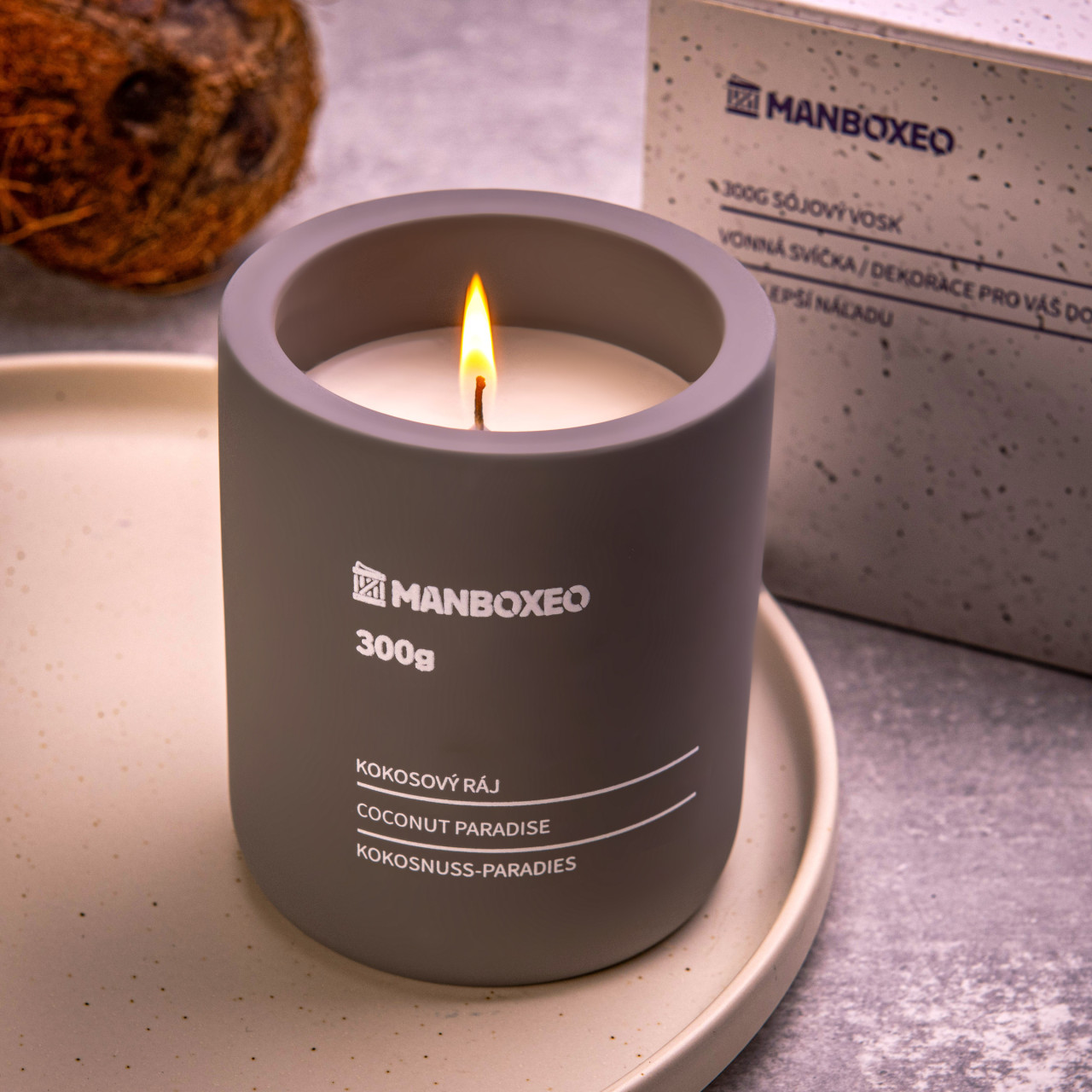 Zement-DUFTKERZE in Geschenkschachtel 300g – Kokosparadies – Eine Betonkerze? Nein, Sie sehen richtig! Sie duftet nach Kokos und begeistert mit ihrem minimalistischen Look, der überall gut ankommt. Zusätzlich lässt sich ein individueller Schriftzug oder ein Motiv eingravieren.