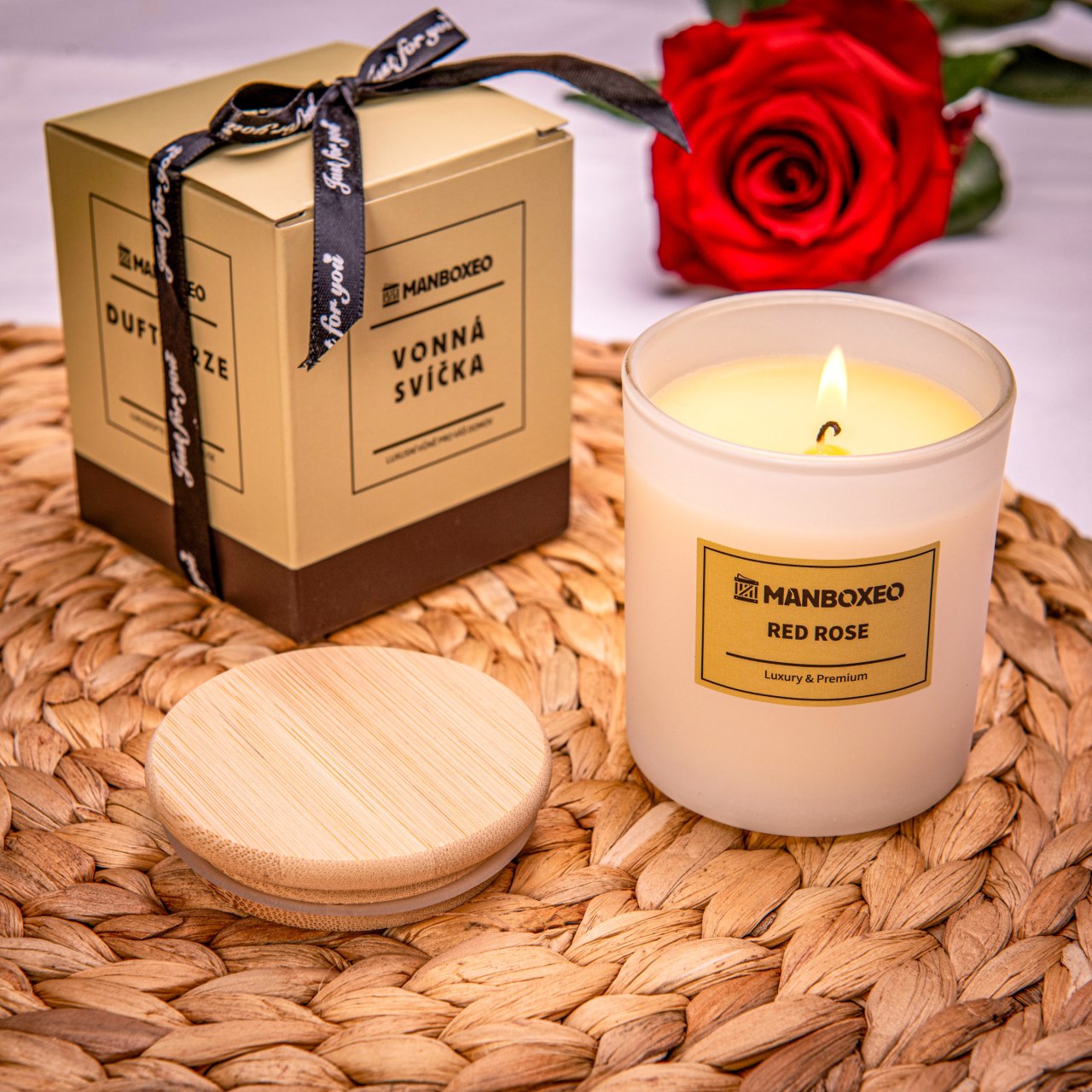 Kerze mit Holzdocht in Geschenkbox mit Schleife und intensivem Red Rose Duft 150g