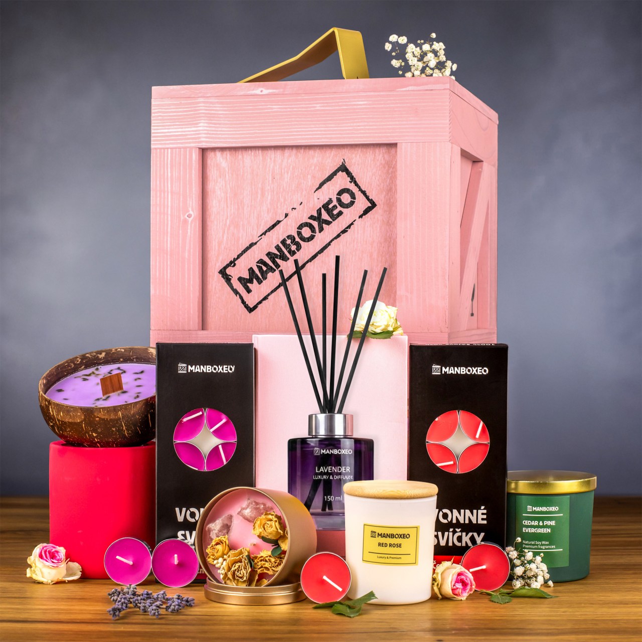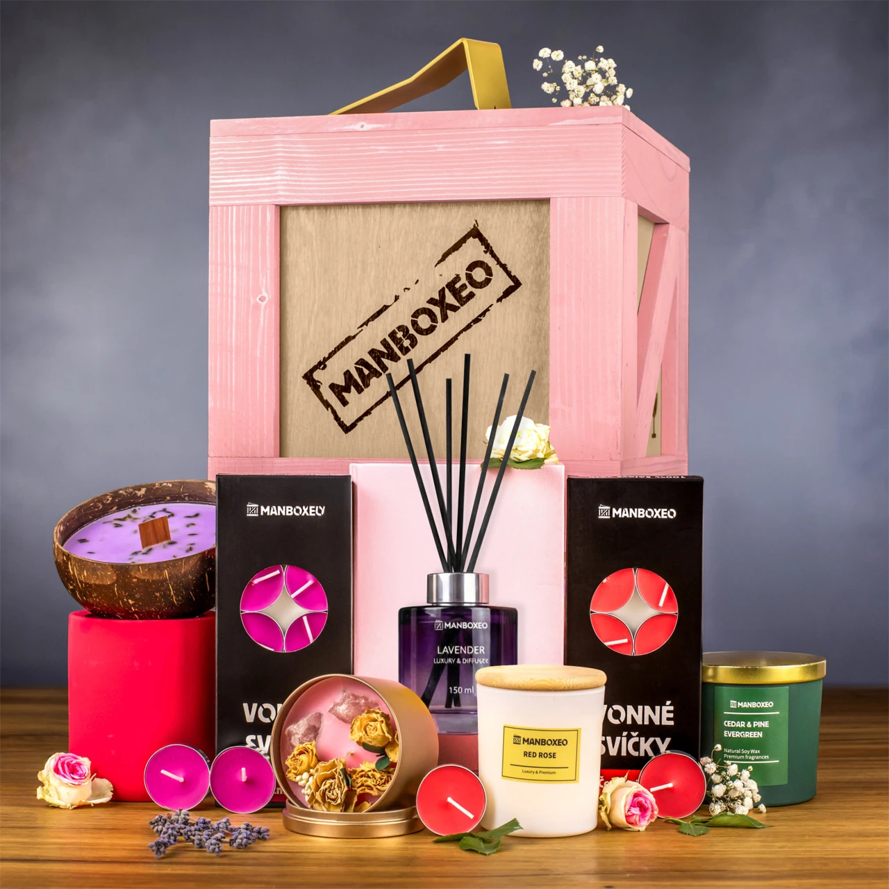Ist die Beschenkte eine Liebhaberin blumiger Düfte? Dann stellen Sie sich lieber hinter sie, wenn sie die Truhe öffnet – für den Fall, dass ihr vor Freude die Knie weich werden! Im Inneren wartet nämlich eine geballte Ladung Kerzen und ein Aroma-Diffusor, deren Duft sie direkt in einen blühenden Blumengarten entführt. Das wird unvergesslich!