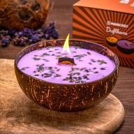 Kokos-DUFTKERZE – Lavendel – Nein, das ist kein Dessert – sondern eine natürliche, duftende, liebevoll gestaltete Kerze mit Lavendelduft und knisterndem Holzdocht, die eine friedliche Wohlfühlatmosphäre wie am Kamin schafft.