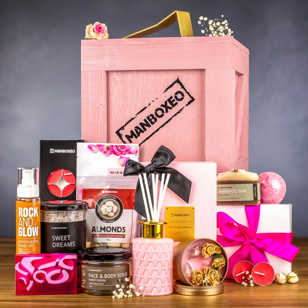 Hat es die Beschenkte hineingeschafft? Gratulation! Die Kiste ist bis zum Rand mit duftenden und essbaren Geschenken gefüllt. Die Flasche hochwertigen Proseccos haben wir mit luxurieller Kosmetik, Duftkerzen und einer süßen Überraschung ergänzt – zusammen sorgt to für ein perfektes Wellness-Erlebnis. Einfach Wellness, nur bequem von zu Hause. Und genau das wollt ihr. Ab jetzt stellt euch besser nicht zwischen die Frau und die Kiste – das könnte schmerzhaft enden!