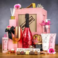 Kisten sind nicht nur für Männer! Diese rosa Schönheit wird jede Frau beeindrucken, der Sie sie schenken. Warum? Im Inneren wartet eine ganze Reihe von Produkten, die definitiv einen Versuch wert sind. Und es gibt viel auszuprobieren. Körperpflege, duftende Kerze, köstliche Pralinen und dazu hervorragender Wein. Pure Wonne!