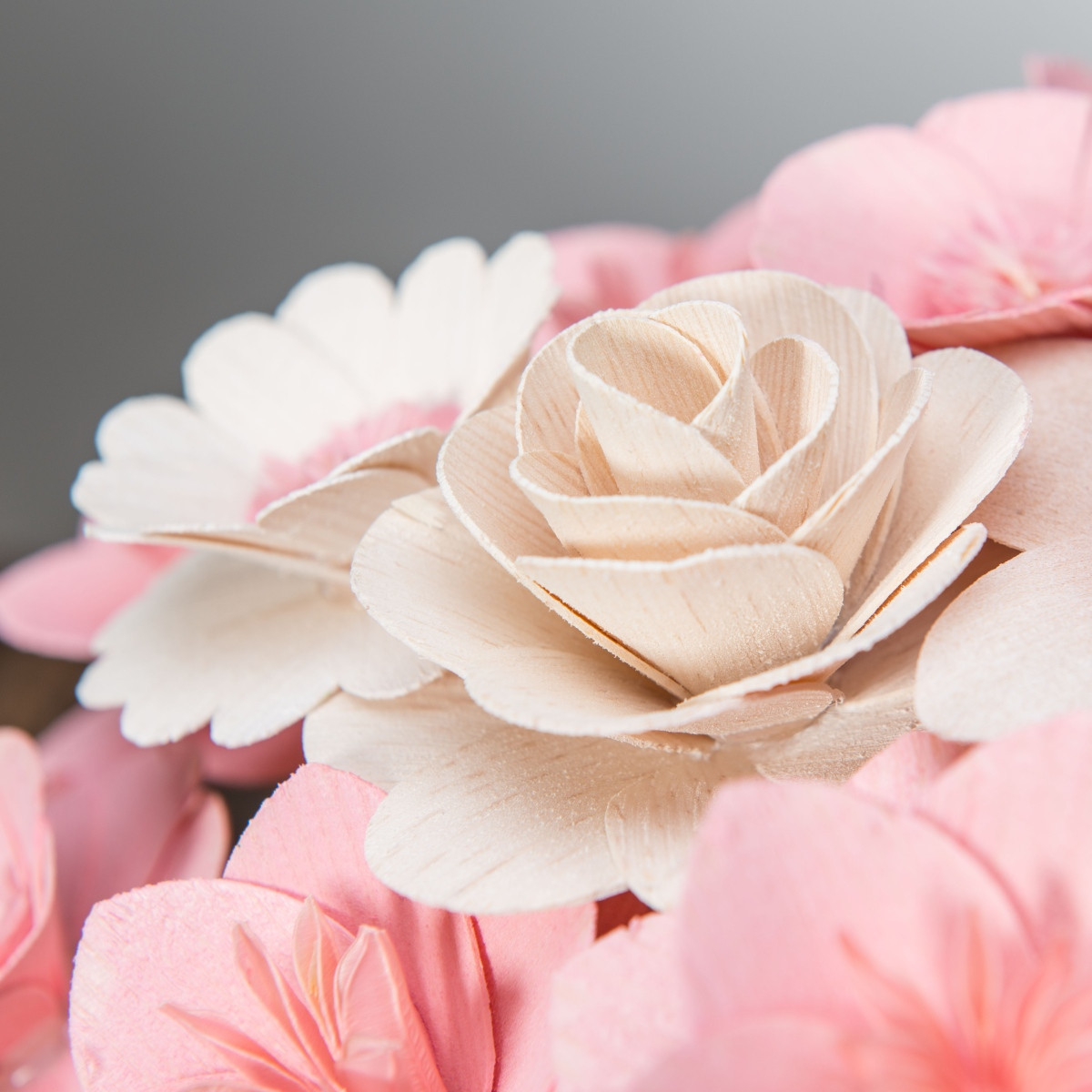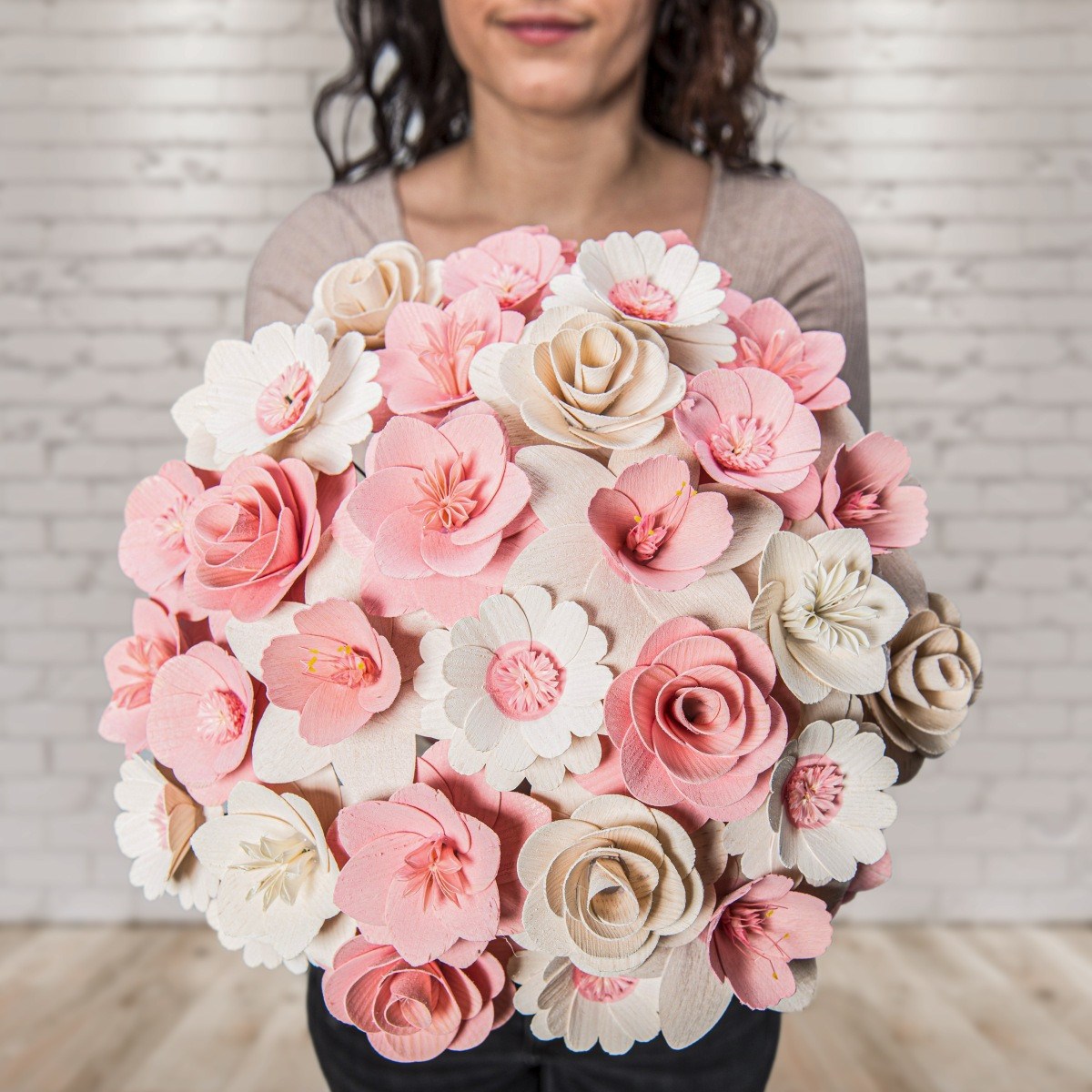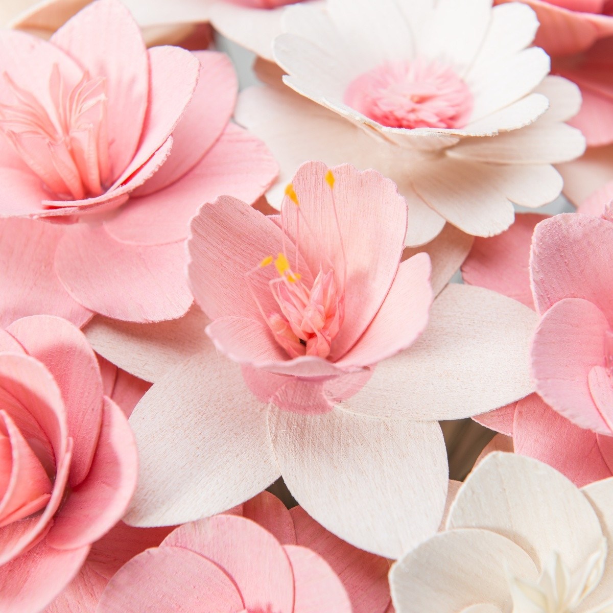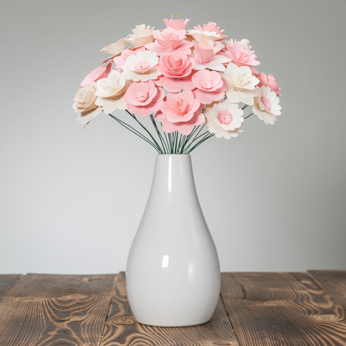 Alle Blumen wurden ausschließlich von Naturmaterialien hergestellt und jede von ihnen ist ein Ergebnis präziser Handarbeit. Nachdem das richtige Holz für die Blätter ausgewählt wurde, muss es handwerklich bearbeitet und gestrichen werden. Die Mitte einiger Blumen besteht sogar aus getrockneten, bemalten Blumenbeeten und aus Pistillen echter Blumen. Sobald alle Komponenten perfekt vorbereitet sind, werden sie von Hand zusammengeklebt und auf einen Drahtstiel gelegt, sodass sie zusammen eine wunderschöne Dekoration jedes Interieurs bilden.