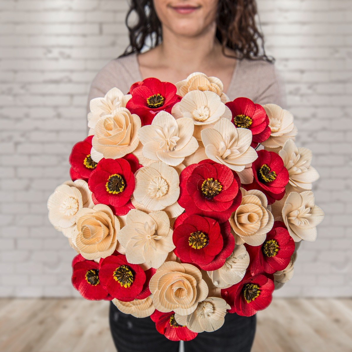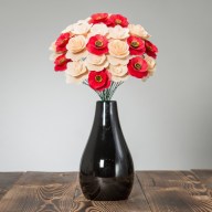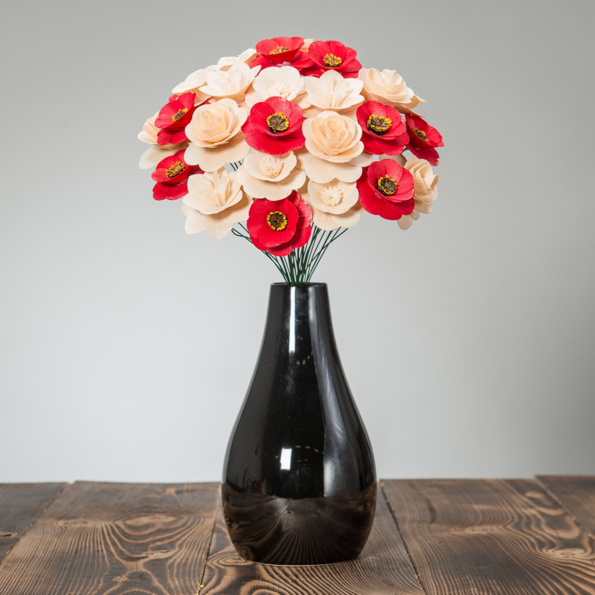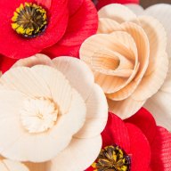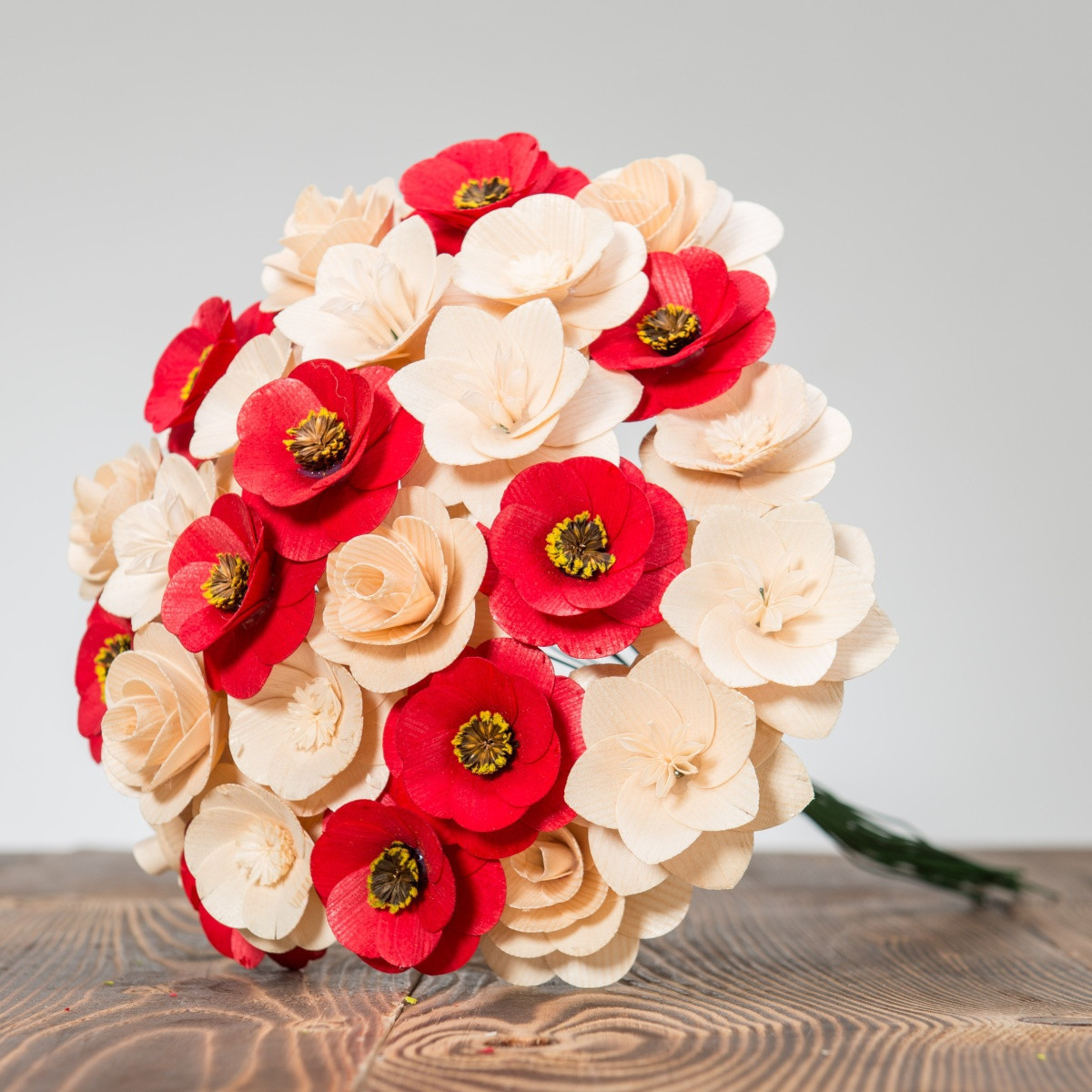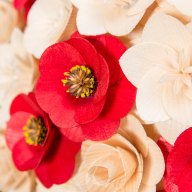 Alle Blumen wurden ausschließlich von Naturmaterialien hergestellt und jede von ihnen ist ein Ergebnis präziser Handarbeit. Nachdem das richtige Holz für die Blätter ausgewählt wurde, muss es handwerklich bearbeitet und gestrichen werden. Die Mitte einiger Blumen besteht sogar aus getrockneten, bemalten Blumenbeeten und aus Pistillen echter Blumen. Sobald alle Komponenten perfekt vorbereitet sind, werden sie von Hand zusammengeklebt und auf einen Drahtstiel gelegt, sodass sie zusammen eine wunderschöne Dekoration jedes Interieurs bilden.