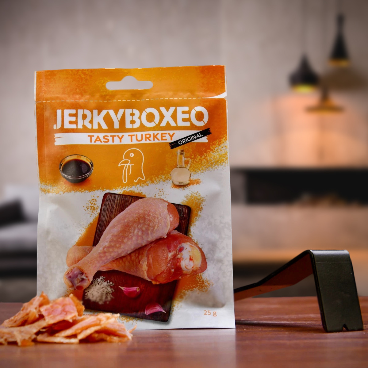 Jerkyboxeo TASTY TURKEY ORIGINAL 25 g — Aller guten Jerky sind drei. Putenjerky mit Meersalz aus dem Toten Meer – perfekt für den Wald, ins Büro oder in die Berge. Kurz gesagt: überall dort, wo Füße und Appetit Sie hintragen.