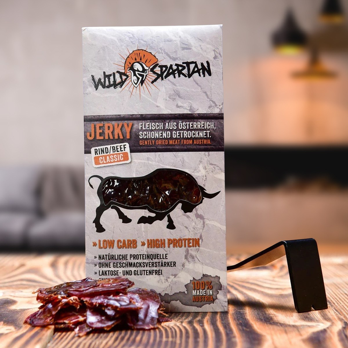 WildSpartan Jerky CLASSIC Rind 40 g — Fleisch mit einem Geschmack so stark wie ein Bulle! Getrocknetes Rindfleisch WildSpartan aus Österreich hat ein intensives, fleischiges Aroma und zergeht regelrecht auf der Zunge. Glutenfrei, ohne Zusatzstoffe.