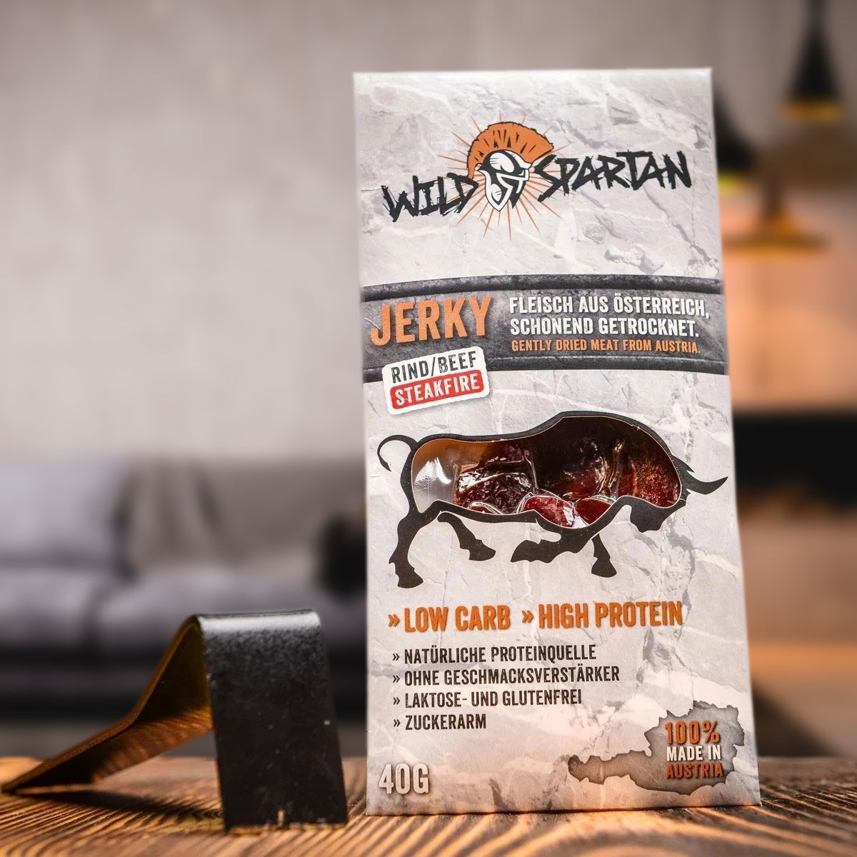 WildSpartan Jerky STEAKFIRE Rind 40 g — Steak für die Hosentasche! Einzigartiges getrocknetes Rindfleisch aus den österreichischen Alpen, das dank der köstlichen Kombination aus Steakgeschmack, Paprika, mildem Chili und Pfeffer niemanden kaltlässt. Zartes Fleisch, das auf der Zunge zergeht. Glutenfrei, ohne Zusatzstoffe.