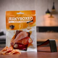 Jerkyboxeo TASTY BEEF HOT AND SWEET 25 g — Ein großartiger Snack für unterwegs oder im Büro. Rindjerky mit Meersalz aus dem Toten Meer, einer Prise Chili und einem Hauch Karamell – gibt Energie und sorgt für ein sanftes Prickeln auf der Zunge. Ideal für Liebhaber pikanter Aromen.