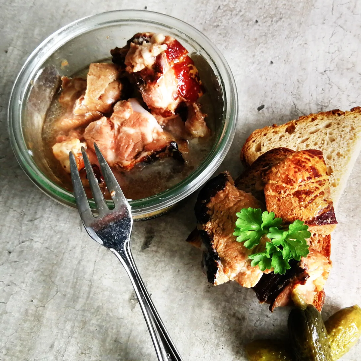 In Buchenrauch geräuchertes Schweinefleisch –köstliches Schweinefleisch, das auf Buchenholz geräuchert wurde. Ohne Zusatz von Salz und Wasser, die Soße besteht aus dem reinem Fleischsaft. Glutenfrei.