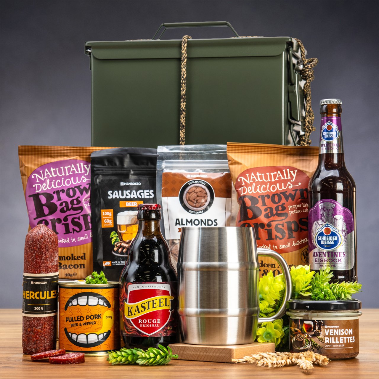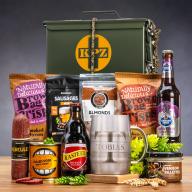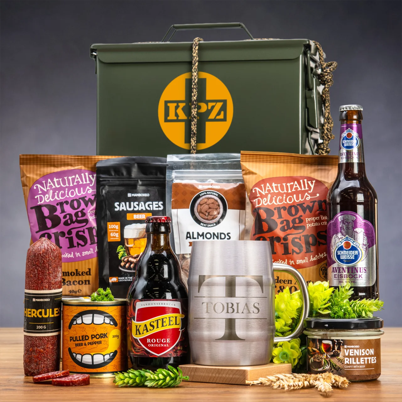 Diese Munitionskiste zu öffnen hat den Beschenkten vielleicht einiges an Kraft gekostet – aber jetzt bekommt er sie garantiert schnell zurück! Sobald er den Deckel hebt, wird er etwas sehen, wovon er nicht einmal zu träumen gewagt hat. Ausgewählte Bierspezialitäten, herzhafte Fleischsnacks, die jeden Gaumen erfreuen – und unser perfekter Kühlbierkrug. Davon träumt jeder Bierliebhaber!