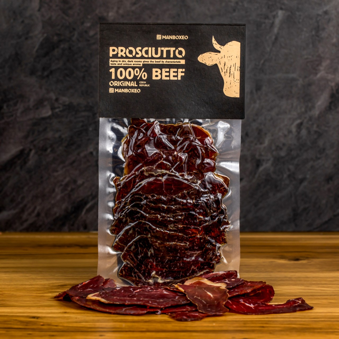 Prosciutto aus hochwertigem Rindfleisch – leckeres Prosciutto aus einer familiären Fleischerei von tschechischer Stadt Krkonoše werden Sie einfach lieben. Dank dem Reifen in dunklen trockenen Räumen konnte sich der charakteristische Geschmack und das Aroma voll entwickeln. Prosciutto ist fermentiert, deswegen kann man ein bis zum Öffnen bei Zimmertemperatur lagern.