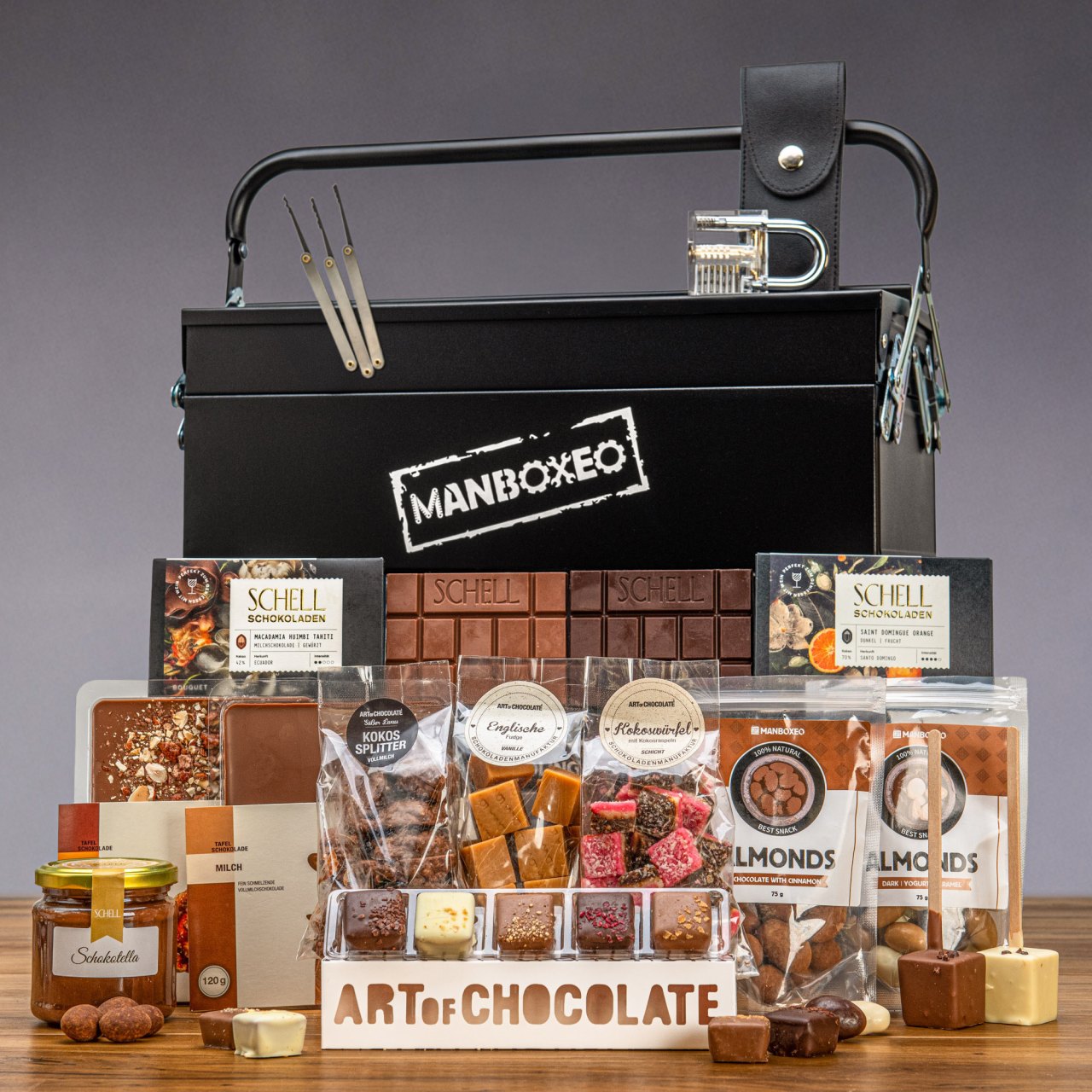 Dachten Sie, in diesem Metallkoffer versteckt sich nur Werkzeug? Falsch gedacht, meine Damen und Herren. Wir haben ihn nämlich randvoll mit Schokoladenspezialitäten gefüllt! Die beste Schokolade in vielen Formen – Tafeln, schokolierte Nüsse, Pralinen. Der Plan ist klar: alles probieren, ausgiebig naschen und die Geschmacks- und Nervenzellen erfreuen. Als besonderes Extra gibt’s ein multifunktionales Werkzeug, das wir auf Wunsch mit dem Namen des Geburtstagskindes gravieren.